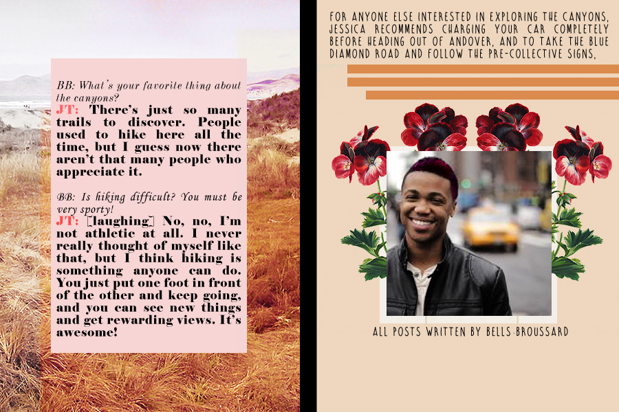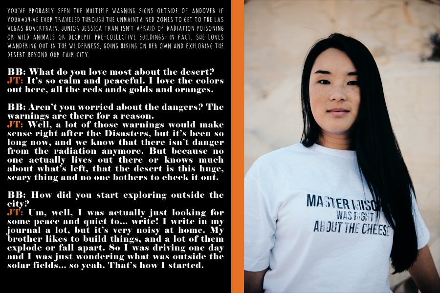 You’ve probably seen the multiple warning signs outside of Andover if you’ve ever traveled through the Unmaintained zones to get to the Las Vegas hovertrain. Junior Jessica Tran isn’t afraid of radiation poisoning or wild animals or decrepit Pre-Collective buildings; in fact, she loves wandering out in the wilderness, going hiking on her own and exploring the desert beyond our fair city.