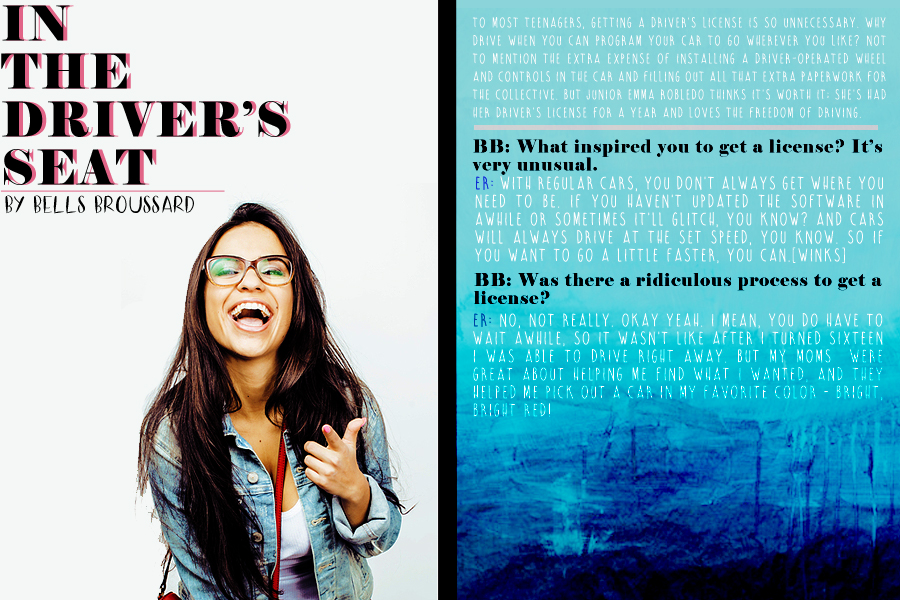 To most teenagers, getting a driver’s license is so unnecessary. Why drive when you can program your car to go wherever you like? Not to mention the extra expense of installing a driver-operated wheel and controls in the car and filling out all that extra paperwork for the Collective. But junior Emma Robledo thinks it’s worth it; she’s had her driver’s license for a year and loves the freedom of driving.