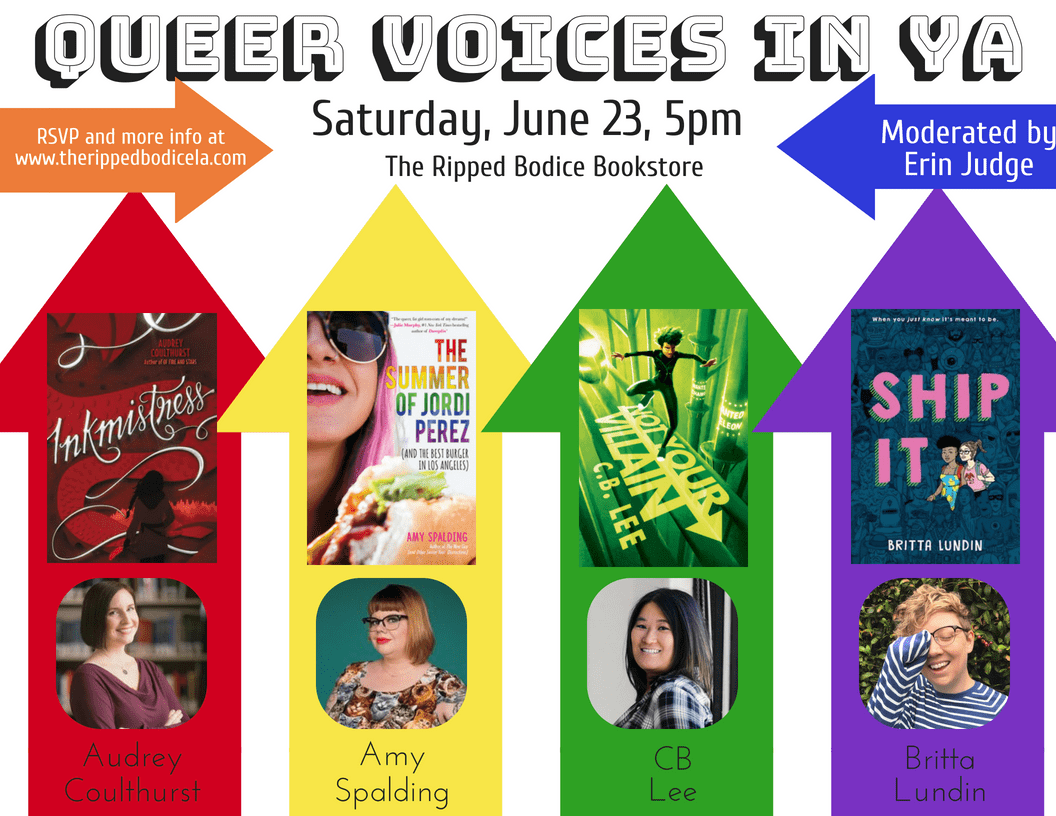 I always love being at the Ripped Bodice bookstore, and it was so much fun chatting with amazing authors Audrey Coulthurst, Amy Spalding and Britta Lundin on our Queer Voices in YA conversation. We talked about our writing process, being queer and how our identity has impacted our work, and about our upcoming books with writer and comedian Erin Judge.